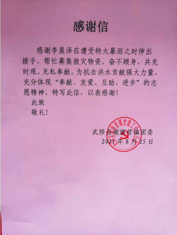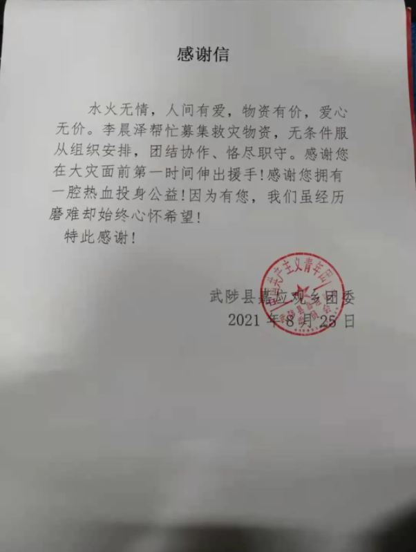 7月25日,团省委紧急征集志愿者,一批爱心物资要运送焦作武陟受灾一线,得知情况后,李晨泽二话不说,积极报名参与,当天下午在团省委门前协助装车后 亚洲91,天色已晚,他和司机带着水,方便面,面包等5吨物资出发了,因多处路况受损,高速难以顺畅通行,司机几经转弯绕道,于当晚11点到达第一个捐赠点嘉应观乡,“路上很颠簸,又困又饿又累,那么晚了村干部和村民还在村口等我们,真的很想哭,又感觉很自豪,”。